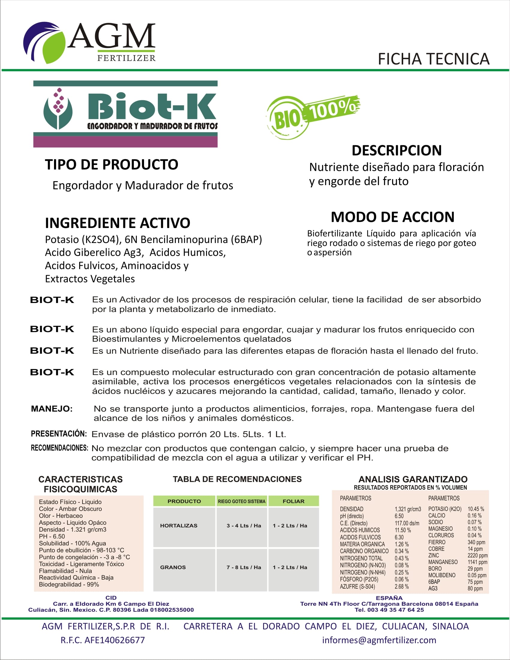 Potasio (K2SO4), 6N Bencilaminopurina (6BAP), Ácido Giberélico Ag3, Ácidos Húmicos, Ácidos Fúlvicos, Aminoácidos y Extractos Vegetales