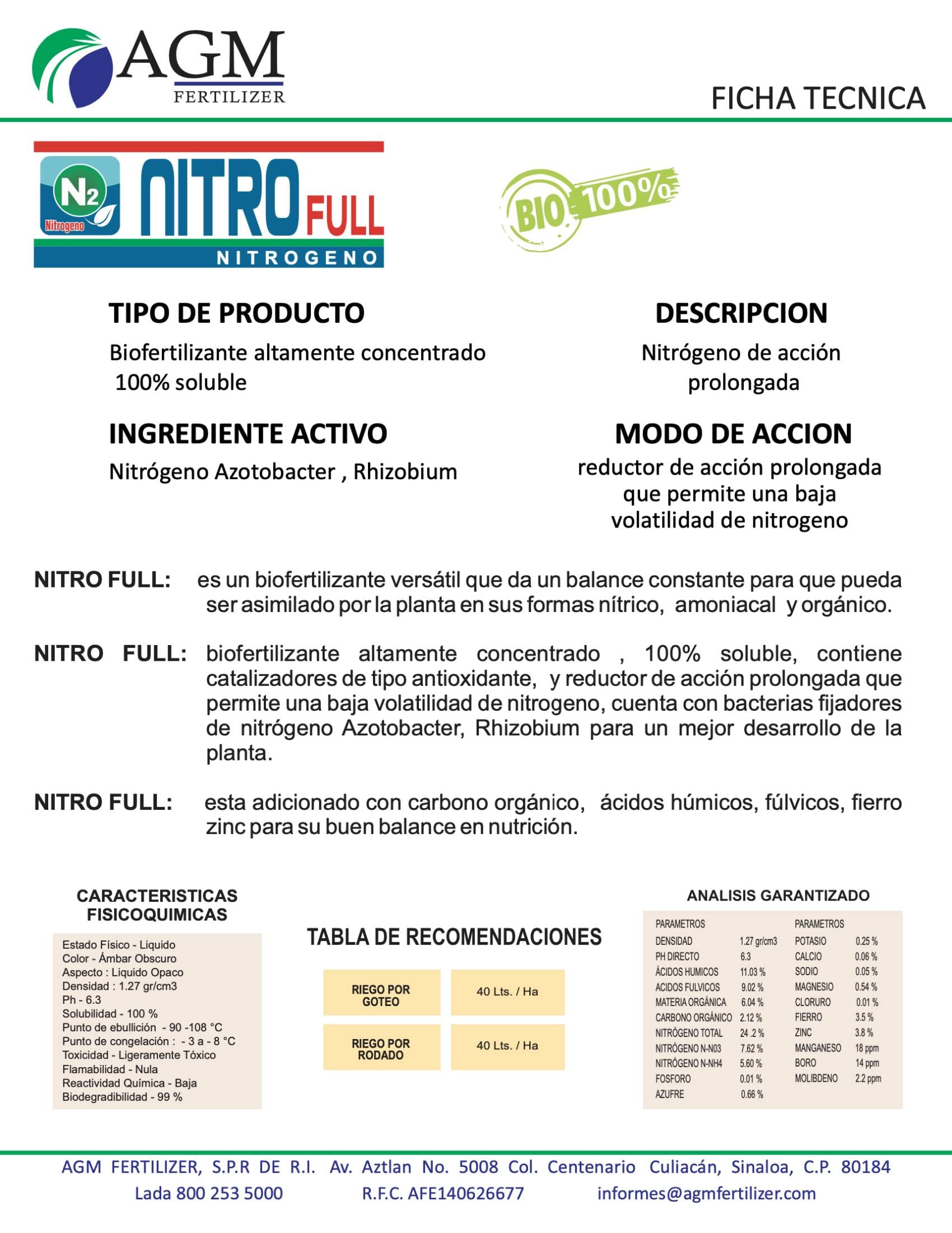 Nitro-Full es un biofertilizante versátil que da un balance constante para que pueda ser asimilado por la planta en sus formas nítrico, amoniacal y orgánico.