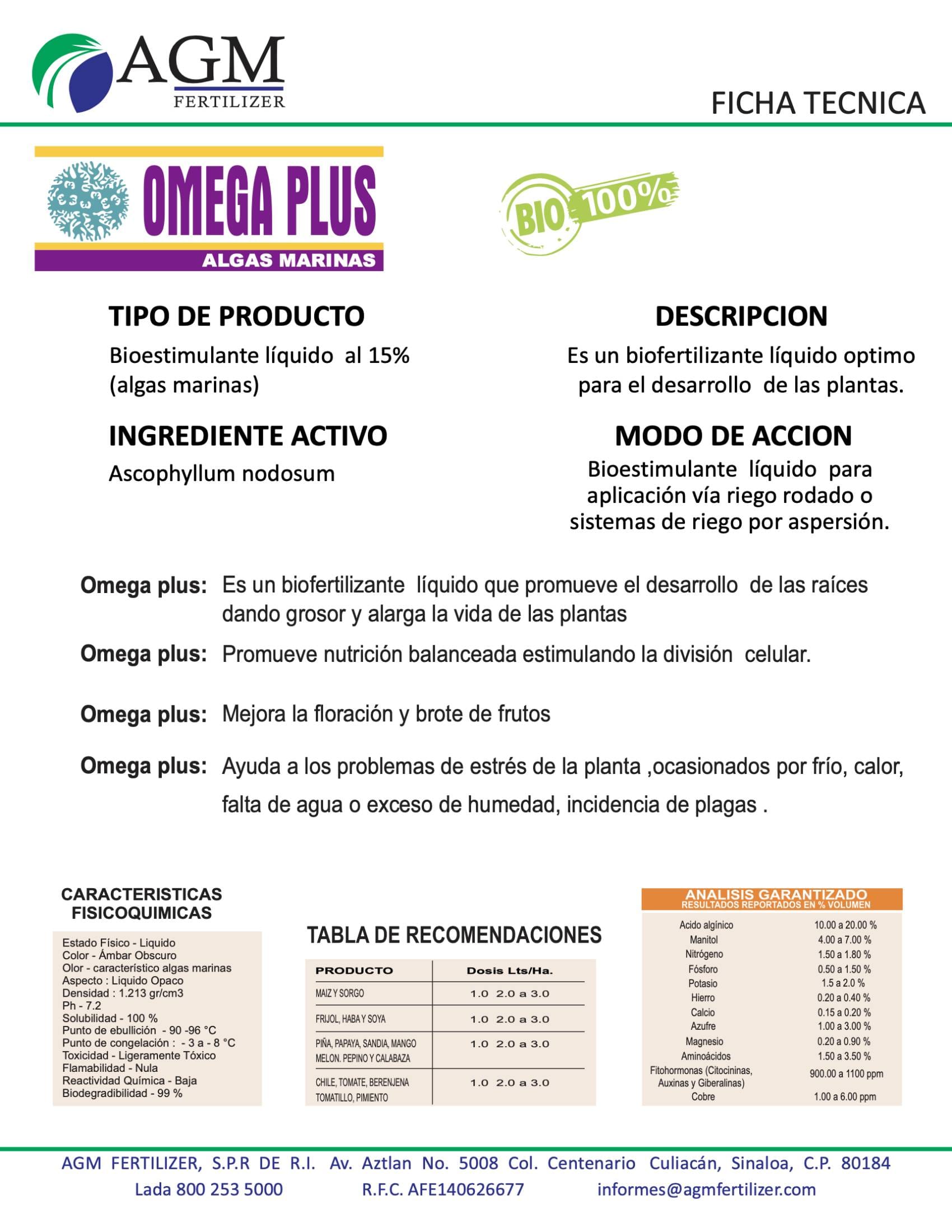 Omega Plus biofertilizante líquido que promueve el desarrollo de las raíces dando grosor y alarga la vida de las plantas.